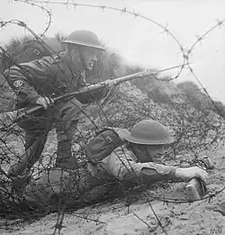 2. ^ Having entered military service, a recruit was assigned to the General Service Corps. They would then undertake six weeks training at a Primary Training Centre and take aptitude and intelligence tests. The recruit would then be posted to a Corps Training Centre that specialized in the arm of the service they were joining. For those who would be joining the infantry, Corps training involved a further sixteen week course. For more specialized roles, such as signallers, it could be up to thirty weeks.[6]