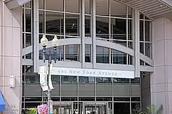 The south facade of 901 New York Avenue NW, showing the main entrance and atrium.