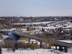 The City of Edmonton commissioned the 1963 Metro Edmonton Transportation Study (METS) to address the need for free-flow traffic corridors and more river crossings in the downtown area. The plan proposed a downtown freeway loop with feeder routes, including an eastern approach via 98 Avenue, a southern approach via the Mill Creek Ravine which would continue north across the river and continue north parallel to 95 Street, and a western approach via the MacKinnon Ravine and 100 Avenue. The eastern and southern approaches would be connected to the western approach via the south leg of the freeway loop, which cross the river near the Low Level Bridge and follow River Valley Road, along with a new arterial roadway via 97 Avenue.[8] In the late 1960s and early 1970s, road improvement projects outside downtown had connections to the 98 Avenue approach in mind. A major interchange at Highway 16 and Highway 16A (present-day Yellowhead Trail and Anthony Henday Drive) opened in 1971 and an interchange at Highway 16A and Highway 14X (present-day Anthony Henday Drive and Baseline Road, respectively) opened in 1975, featuring grading for a future eastbound to northbound flyover that was ultimately not constructed, the grading was removed when Anthony Henday Drive was reconstructed in the late 2010s.[9][10] As the residential neighbourhoods in eastern Edmonton were developed, Terrace Road was constructed to allow for continuous movement between Highway 16A east and 98 Avenue. The freeway proposal through the North Saskatchewan River valley and its feeder ravines proved to be very controversial, with public protests suspending construction shortly after clearing work had begun in the MacKinnon Ravine. In tandem with cost overruns, the majority of project was cancelled in 1974;[11][12] however, remnants of the larger project which were constructed include the interchange with Connors Road, the James MacDonald Bridge, and the tunnel underneath the Alberta Legislature grounds.