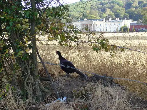 This house was built near to the castle in 1814 by the Smythe family. The hall is in classical style and is a Grade II* listed building.[1] It is surrounded by parkland, with two lakes and a Gothic folly (Sham Castle). This folly has round towers, gothic windows and dates to 1780, standing on a mound in a field surrounded by trees. It was built for Sir Edward Smythe by Joseph Bromfield and used by the Smythe family as a music room.[2]