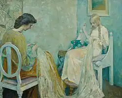 Finck's work is thematically oriented towards salon painting of the late 19th century, using impressionistic color schemes, as seen in the paintings Lute Player, Daydreaming, and Reading. She also incorporated elements of Art Nouveau, as in Worpswede Evening from 1904.