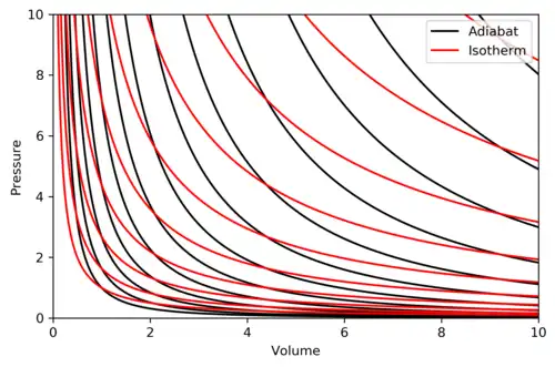 - If adiabats and isotherms are graphed at regular intervals of entropy and temperature, respectively (like altitude on a contour map), then as the eye moves towards the axes (towards the south-west), it sees the density of isotherms stay constant, but it sees the density of adiabats grow. The exception is very near absolute zero, where the density of adiabats drops sharply and they become rare (see Nernst's theorem).