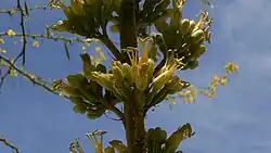 Flowers on the 11 foot tall flowering shaft of Agave x arizonica, flowers of a palo brea (Parkinsonia praecox) tree in background