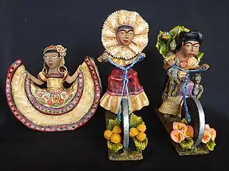 Born in 1943, Guillermina Aguilar Alcántara is the first-born daughter of Isaura Alcántara Díaz and Jesús Aguilar Revilla.[2] At an early age, she would help her mother with household chores and received no formal education.[2] Guillermina started her artistic practice through the modeling of animal figures and would later expand her craft to reflect her surroundings and cultural customs with events such as weddings, wakes, and baptisms, to name a few.[3] Additionally, Guillermina's work often depicts female figures in their traditional Oaxacan dress with expressive facial features as well as elements of nature.