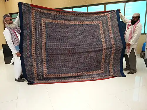 Ajrak (Sindhi: اجرڪ; Saraiki: اجرک) is a unique form of textile block-printing found primarily in Sindh, Pakistan[1] and South Punjab in the case of Saraiki ajrak. It is also found in village of Ajrakhpur in the bordering Kutch district of India.[2]