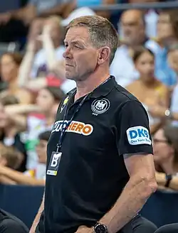 Alfreð Gíslason (born 7 September 1959)[1] is an Icelandic handball coach and former player who is currently the head coach of the German men's national team. He won titles in Iceland, Germany and Spain as a player before starting his coaching career in 1991 with Icelandic team KA as a player-coach. He later coached German club SC Magdeburg, where he won the Bundesliga and the EHF Champions League, the Icelandic men's national team and German club THW Kiel, where he won six Bundesliga, six DHB-Pokal and two EHF Champions League titles.[2][3] Alfreð was the Icelandic Sportsperson of the Year in 1989 and inducted into the National Olympic and Sports Association of Iceland Hall of Fame in 2019.[4][2]