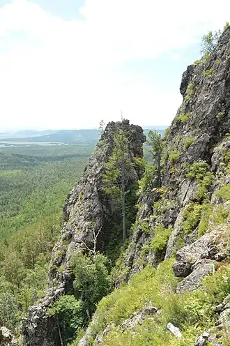 The landscapes of the park include forested mountains, steep canyons with streams and waterfalls, springs, and vistas of the vast undulating plains to the south. the tops of the mountains are mostly dome-shaped with bare rock in places.[4] The rock landforms reflect the ancient remains of volcanoes (including Mt. Alkhanai itself), and an underlying fault on which the area was centered in the Jurassic period. There are few lakes, but many wetlands along the streams, and the many springs are cold with calcium carbonate.[4]