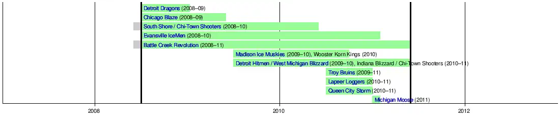 Michigan MooseQueen City StormLapeer LoggersTroy Bruins (2009–2010)Indiana BlizzardWooster Korn KingsBattle Creek RevolutionEvansville IceMen (2008–2010)Chi-Town ShootersChicago Blaze (ice hockey)Detroit Dragons