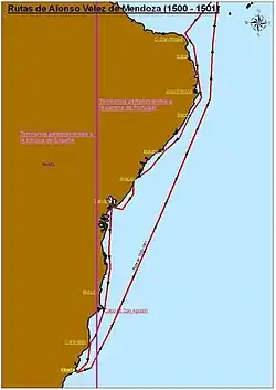 Commander Alonso Vélez de Mendoza of the Order of Santiago was born in Moguer, Spain in the late 15th century. On June 6, 1499, he obtained a license from the Catholic Monarchs to sail to the Indies, which authorized him to take four caravels, although ultimately he only chartered two. They were supposed to head north to start the exploration of the coast of North America, or perhaps to enter into the competition of the Brazilian exploration.