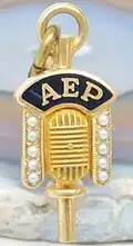 Its badge was in the shape of a microphone with seed pearls along either side, with the Greek letters ΑΕΡ across the top.[1] Its emblem combined a stylized single-sprocket film cell, a poly-directional microphone, and the front turret of a three-lens camera into a symbol that was on top of a stylized motion picture film frame.[6]