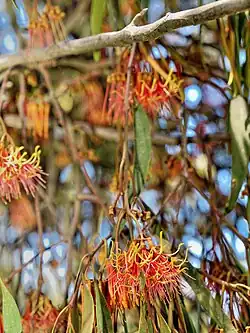 Amyema pendula, also known as drooping mistletoe or furry drooping mistletoe,[2] is a species of flowering plant, an epiphytic hemiparasitic plant of the family Loranthaceae, found attached to several species of Australian eucalypt and occasionally on some species of Acacia. It is endemic to south-eastern Australia. It is the most common mistletoe in Victoria, especially on the coastal side of the Great Dividing Range. It has shiny leaves and red flowers arranged in groups of 3 or 4. It is distinguished from the similar Amyema miquelii through the lack of individual stalks on the flowers.
