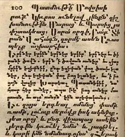 The social-political and cultural upheaval that began in the first half of the 17th century also affected literary literature. Alongside the development of the art of copying ancient manuscripts, printing, and folklore, new literary values were created.[203] At the same time, due to the political situation, the changes of the new era slowly penetrated into Armenia. The 17th-18th centuries essentially continued and completed medieval literature.[13] At this time, the ideology of the Armenian national liberation movement and the bourgeois trade was also forming. Lyrics remained the leading literary genre. According to Henrikh Bakhchinyan, the three main directions of its development were religious-patriotic poetry, secular poetry, and folk gusan songs. Despite their unique features, these directions were not strictly differentiated and represented mutual influences within the framework of the unified artistic thinking of that time. Sometimes in the works of one author, one can see different poetic directions of the era. In this sense, the creativity of Martiros Ghrimetsi from "The Armenian Grimoire," combining religious hymns, secular poetry, and pastoral poetry, is characteristic.[204] As noticed by S. La Porta, the opposition between religious and secular literature represents a false dichotomy: "Instead, they should be seen as brothers and sisters sharing one destiny".[205] All dominant tendencies reflected literary continuity with subsequent linguistic-poetic properties, themes, and directions. For example, religious-patriotic poetry repeated and developed a similar medieval tradition. Its language was mainly grabar, sometimes Middle Armenian, and the themes were taken from the Bible or Armenian history. It had enlightenment goals, with the audience mainly being future leaders and enlighteners of the church. In turn, religious-patriotic poetry is divided into three parts: purely religious, national-church, and historical-political. Purely religious poetry lagged behind in its artistic qualities compared to similar medieval works, which was a consequence of the dominance of religious ideals over secular ones in the modern era. However, religious poetry acquired a greater social mission. National-church poetry of the 18th century gained particular weight, synthesizing biblical and Armenian national plots. Historical-political poetry, reflecting the military past and present of the Armenian people, its liberation aspirations, also developed.[204] Most poets of the 17th century were representatives of the common people, which largely determined the ideological aspect of their literature.[88] Secular themes and thematic diversity predominated in literature as a whole.[206]