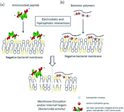 Electrostatic and hydrophobic interaction of an antimicrobial polymer and biomimetic polymer, causing membrane disruption and cell death.[8]