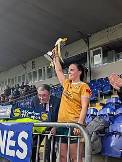 Antrim captain Bronagh Devlin lifts the Division 4 trophy following her side's win over Fermanagh in the league final on 13 April 2025