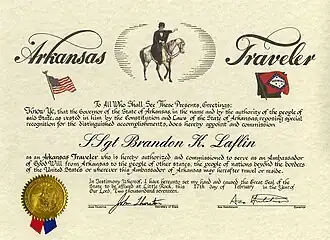 The Arkansas Traveler is an honorary title bestowed on notable individuals who, through their actions, serve as goodwill ambassadors for the US state of Arkansas. A certificate is signed by the governor, secretary of state and the recipient's sponsor, and given to the honoree during a ceremony attended by the signers.[1][2]