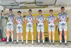 Having received continued support from the military leadership for another four years, the team began exploring promotion to become a UCI Continental team, with support from civilian sponsors.[8] The success of this application was announced in December 2014, with the team finding out through a leak to the press. This promotion was complicated by the rules about French cyclists. Riders on UCI Continental teams are not considered professionals by the UCI, but the rules of French cycling mandate professional contracts for them. Since the riders on Armée de terre are soldiers rather than professional cyclists, a special exception had to be made to allow the team to compete.[9] The team retained several of its riders from the 2014 season into the international ranks, including French under-23 champion Yann Guyot.[9] The riders continued to live in the team's base, two to each room; if a race did not provide accommodation to the riders, they stayed in the nearest military barracks. Each rider did military training in the two months of the off-season, learning a military specialism as well as training as a cyclist.[10]