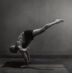 Ashtanga yoga (not to be confused with Patanjali's aṣṭāṅgayoga, the eight limbs of yoga) is a style of yoga as exercise popularised by K. Pattabhi Jois during the twentieth century, often promoted as a dynamic form of medieval hatha yoga.[1] Jois claimed to have learnt the system from his teacher Tirumalai Krishnamacharya. The style is energetic, synchronising breath with movements. The individual poses (asanas) are linked by flowing movements called vinyasas.[2]