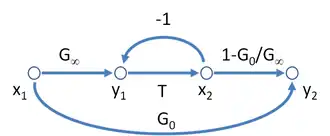 where is the return ratio with the input source disabled (equal to the negative of the loop gain in the case of a single-loop system composed of unilateral blocks), G is the asymptotic gain and G0 is the direct transmission term. This form for the gain can provide intuitive insight into the circuit and often is easier to derive than a direct attack on the gain.