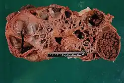 - ^ Hajj P, Ferlicot S, Massoud W, Awad A, Hammoudi Y, Charpentier B, et al. (September 2009). "Prevalence of renal cell carcinoma in patients with autosomal dominant polycystic kidney disease and chronic renal failure". Urology. 74 (3): 631–634. doi:10.1016/j.urology.2009.02.078. PMID 19616833.