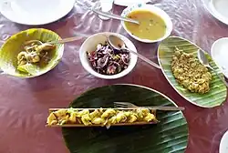 The Chittagong Hill Tracts are home to tribes with their own culture and cuisine.[38][39] Chakma cuisine uses sidol, a paste made from fermented shrimps and fish, and suguni, dried shrimp or fish.[40] Their dishes use more herbs from the hills more than the spices common in Bengali dishes.[40] Important seasonal ingredients include wild mushrooms and the Flowers of ginger and turmeric plants.[40] Sumoh gorang is a dish cooked in bamboo and Hebaang is baked in banana leaves in a mud oven.[40] Marma cuisine uses a paste of dried fish called nappi.[4] Rice beer is a popular drink.[4]
