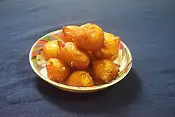 Ledikeni is a light fried reddish-brown ball made of chhena and flour, soaked in sugar syrup.[84] It was devised in the mid-19th century and named after Lady Canning, the wife of the Governor-General of India.[85][86]