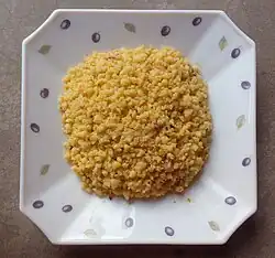Nunor Bora is a savoury snack made of rice flour and with onion, ginger and turmeric, fried to a golden colour.