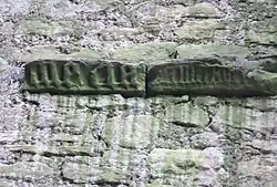 Set within the main fireplace of the keep are two red sandstone carved pieces with Gothic script. One reads 'Maria' and the other with smaller script has not been deciphered. Sandstone pillars on either side of this fireplace carry carvings of climbing plants that may be ivy. One suggestion regarding the Gothic script carvings in the fireplace is that they could be the names of saints and that this was a religious 'Apotropaic' protective device to prevent the ingress of evil spirits into the house through an otherwise 'unprotected' entry point.