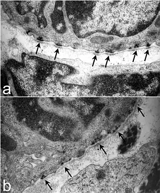 TEM image of the tracheal basal lamina in mice. The darkened areas with the arrows pointing to them display the location of hemidesmosomes connecting the layer of basal cells to the basal lamina.
