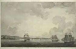 On July 12, the British ships Phoenix and Rose sailed up the harbor toward the mouth of the Hudson.[29] The American batteries opened fire from the harbor defenses of Fort George, Fort Defiance, and Governors Island, but the British returned fire into the city. The ships sailed along the New Jersey shore and continued up the Hudson, sailing past Fort Washington and arriving by nightfall at Tarrytown, the widest part of the Hudson.[30] The goals of the British ships were to cut off American supplies from New England and the north and to encourage Loyalist support. The only casualties of the day were six Americans who were killed when their own cannon blew up.[30]