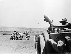 On 22 September an aerial reconnaissance reported that Haifa had been evacuated by the Ottoman army. This was found to be inaccurate when the Haifa Annexation Expedition was stopped by accurate Ottoman artillery and machine gun fire.[12] A reconnaissance by armoured cars of the Light Car Patrol encountered a redoubt 200 yards (180 m) from the road to Haifa. This strong rearguard with machine guns was supported by effectively positioned artillery deployed on the lower slopes of Mount Carmel. The redoubt was fired on by the cars' machine guns and quickly surrendered, while 2 miles (3.2 km) further on they encountered an Austrian battery of light field guns supported by German machine gunners which stopped the reconnaissance force.[13][14] They controlled the approach road from the east which ran between the mountain and the Nahr el Muqatta. This strong position could not be outflanked because the Nahr el Mugatta river was edged on both sides by marshes making it virtually impossible to cross.[14] The 5th Cavalry Division was ordered to capture Haifa and Acre 12 miles (19 km) north west the following day.[15]