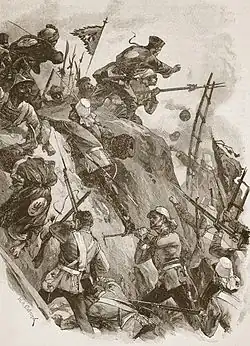 The Anglo-French force initially attacked the main gate of the fortifications, but it was found there were two wet ditches and many spikes. An engineer managed to cut the ropes holding up the drawbridge,[3] but it was too heavily damaged by artillery to be effectively used. The main attack was therefore made against the walls using the ladders.[2]: 513  The French column managed to get onto the parapet first.[3] The first British officer to enter the fort was Lieutenant Robert Montresor Rogers, who was later awarded the Victoria Cross for his bravery that day. He was closely followed by Private John McDougall, who was also awarded the Victoria Cross. Lieutenants Nathaniel Burslem and Edmund Henry Lenon, Private Thomas Lane and Ensign John Worthy Chaplin of the 67th Foot Hampshire Regiment were also awarded the Victoria Cross for their bravery. Resistance continued inside the fort for three and a half hours before the fort was cleared of defenders.[3]