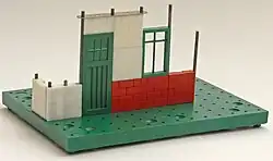 Bayko was primarily intended for the construction of model buildings. The rectangular Bakelite bases had a square grid of holes, spaced at 3/8 inch centres, into which thin metal rods, 75 thou [1.9 mm] in diameter, of various lengths, could be placed vertically. In order to make larger models, two or more bases could be joined together by means of metal links secured by screws through holes in the bases. Bakelite bricks, windows and other parts could then be slotted between pairs of rods in order to create the walls of the building. Other commonly used parts included floors (thin sheets of resin bonded paper with the same square pattern grid of holes as bases), and roofs of various types. There were also a large number of other more specialised parts.[4] In the original sets bases were large, and coloured brown; walls were brown/maroon and cream; roofs were deep maroon; and windows were a very dark green, but by 1937 the 'true' colours of red or white walls, green windows and red roofs were established, though bases were still large and brown.