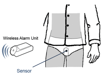 A wireless bedwetting alarm is one in which the sensor and the alarm unit communicate by a means other than a wire. The transmitter, which senses the moisture, is directly attached to the child's underwear. The signal is transmitted wirelessly to a unit that is across the room from the child or an alarm unit in the child's room. Once the alarm unit is activated, it is necessary to get out of bed to turn it off. New wireless alarms add the convenience of also sounding an alarm in the caregiver's room, allowing both patient and caregiver to sleep in the comfort and privacy of their own beds and rooms. Multiple alarms in the house can further increase convenience. Remote controls can facilitate using the wireless bedwetting alarm system, and be especially convenient for the parent or caregiver.[5]