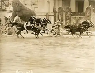 A total of 200,000 feet (61,000 m) of film was shot for the chariot race sequence, which led editor Lloyd Nosler eventually cut to 750 feet (230 m) for the released print.[12] Film historian and critic Kevin Brownlow has described the race sequence as "breathtakingly exciting, and as creative a piece of cinema as the Odessa Steps sequence from Battleship Potemkin", the Soviet film also released in 1925, directed by Sergei Eisenstein who introduced many modern concepts of editing and montage composition to motion-picture production.[13] Visual elements of the chariot race have been much imitated. The race's opening sequence was re-created shot-for-shot in the 1959 remake, copied in the 1998 animated film The Prince of Egypt, and imitated in the pod race scene in the 1999 film Star Wars: Episode I – The Phantom Menace.[14][15]