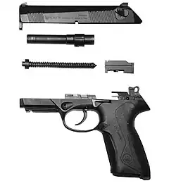 The full size and Compact versions have a spring-loaded disassembly bar, accessed via recesses on both sides of the frame, which must be grasped and pulled down to release the slide. This is different from the rotating takedown pin of Beretta's previous hammer-fired pistols, which the Px4 Subcompact retains.