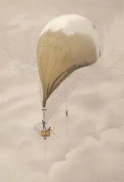 The first balloon flight with the aim of making meteorological observations was undertaken on 30 November 1784 by the American medical doctor John Jeffries together with the professional balloonist Jean-Pierre Blanchard.[5] Some of the first systematic investigations into the upper atmosphere was performed between 1862 and 1866 by the English meteorologist and important pioneer aerologist James Glaisher. On 28 balloon flights, he measured the temperature, air pressure, humidity and the wind speed up to an altitude of almost 9000 meters.[6][7] As his instruments were not sufficiently protected from solar radiation, and as he placed them inside the basket, his temperature measurements were particularly high and affected by errors. In the following years, most scientific balloon flights were made by French scientists such as Camille Flammarion, Gaston Tissandier and Wilfrid de Fonvielle. However, the investigation of the upper atmosphere remained isolated endeavors of individual researchers until the 1890s.[8]