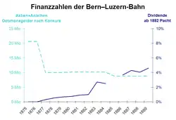 The main shareholders of the Bern-Lucerne Railway were the Canton of Bern and the Canton of Lucerne as well as some municipalities. However, many Emmental municipalities and the City of Bern showed little enthusiasm for subscribing for shares because they had already lost a significant amount of money in the failed Swiss East–West Railway (Ostwestbahn, OWB). Nevertheless, at the end of 1872, the Bern-Lucerne Railway had accumulated over CHF 14 million in the form of stocks and bonds, while construction costs were estimated at CHF 13.7 million.