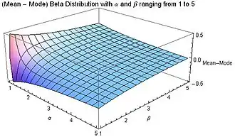 When α, β ≥ 1, the relative error (the absolute error divided by the median) in this approximation is less than 4% and for both α ≥ 2 and β ≥ 2 it is less than 1%. The absolute error divided by the difference between the mean and the mode is similarly small: