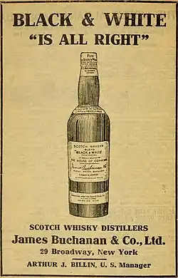 When it was first made in 1879, it was Initially known as Buchanan's Blend and then House of Commons (after the British House of Commons).[1] Its nickname, referring to the black and white labelling, was eventually adopted as the official brand instead.[2] The brand's motif (featuring a black Scottish Terrier and a white West Highland White Terrier) was conceived by James Buchanan during the 1890s.[3]