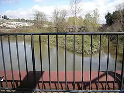 The remnant of the Black River (at right) joins Green River to form the Duwamish (at left). Seen from the Fort Dent Pedestrian Bridge, 2009. This image looks upstream on the Black River and downstream on the Duwamish.