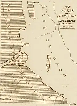 The north-central section of the city of Blue Island is located at the south end of a glacial moraine that once was an island when the waters from Lake Chicago covered the surrounding area at the former lake's Glenwood Stage. Early pioneers gave the ridge the name because at a distance it looked like an island set in a trackless prairie sea. The blue color was attributed to atmospheric scattering or to blue flowers growing on the ridge.[78] The Chicago Democrat, February, 1834 described it:
