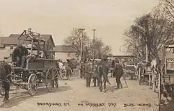 For many years on the first Thursday of every month, Western Avenue south of the canal and to the city limits on 139th Street was host to an open-air market, the Blue Island Market, more commonly known as Market Day. The market was a place where farmers from a wide area surrounding Blue Island came to town to sell their wares to each other and to the public at large.[22] As the postcard image to the right shows, items offered included produce, farm equipment, and livestock, with a local band thrown in to provide entertainment. Market Day began sometime in the last quarter of the 19th century and lasted until May 1924, when it was closed by the city council after a gradual influx of peddlers offering shoddy merchandise discouraged farmer participation and the market was deemed a public nuisance.[23]: 148