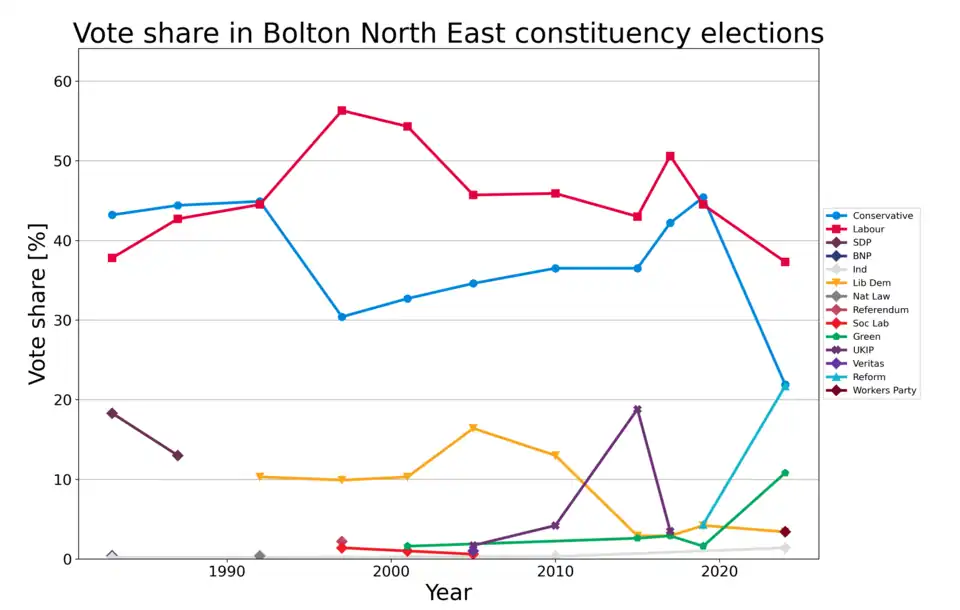 9. ^ "New Seat Details - Bolton North East". www.electoralcalculus.co.uk. Retrieved 19 April 2024.