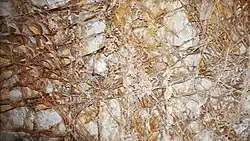 In geology, boxwork is defined as a honeycomb-like structure that can form in some fractured or jointed sedimentary rocks. If the fractures in the host rock are mineralized, they can become more resistant to weathering than the surrounding rock, and subsequent erosion can produce boxwork structures. In mining geology, boxwork is a set of (typically) quartz-lined cavities, retaining the shape of the dissolved ore minerals, in gossans. In classical geology or mineralogy these mineral casts would not be called boxwork, but would instead be called pseudomorphs, or epimorphs. In cave geology, boxwork is an uncommon type of mineral structure, or speleogen (similar to a speleothem, but formed by erosion rather than accretion), occasionally found in caves and erosive environments.