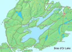 Bras d'Or Lake (Mi'kmawi'simk: Pitupaq) is an irregular estuary[2][3] in the centre of Cape Breton Island in Nova Scotia, Canada.[4] It has a connection to the open sea, and is tidal. It also has inflows of fresh water from rivers, making the brackish water a very productive natural habitat. It was designated the Bras d'Or Lake Biosphere Reserve (now Bras d'Or Lake Biosphere Region) by UNESCO in 2011.[5]