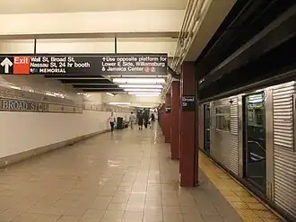 This station has two tracks and two side platforms[43] and is approximately 535 feet (163 m) long.[21] The J train stops here at all times, while the Z train stops here during rush hours in the peak direction.[44] The Broad Street station is the southern terminus of both routes; the next station to the north is Fulton Street.[45] Fixed platform barriers, which are intended to prevent commuters falling to the tracks, are positioned near the platform edges.[46][47] In contrast to the Fulton Street station, which is built on two levels because of the narrowness of Nassau Street, the Broad Street station is wide enough to accommodate both tracks on the same level.[20][21] South of this station, there are two center stub tracks ending at bumper blocks used for laying-up and relaying trains.[20][43] Trains terminate on the southbound track and continue to the center stub tracks, where they reverse direction. There is also a single switch north of the station to enable trains on the southbound track to return to the northbound track.[43]