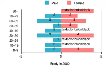 According to the 2002 Poland census, there were 35 people residing in Brody village, of whom 45.7% were male and 54.3% were female. In the village, the population was spread out, with 22.9% under the age of 18, 25.7% from 18 to 44, 17.1% from 45 to 64, and 34.3% who were 65 years of age or older.[1]