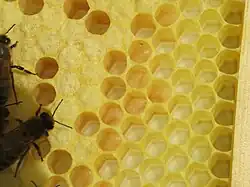 The brood comb is the beeswax structure of cells where the queen bee lays eggs.[1] It is the part of the beehive where a new brood is raised by the colony. During the summer season, a typical queen may lay 1500-2000 eggs per day, which results in 1500-2000 bees hatching after the three-week development period.