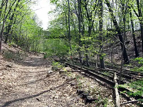 Brooklyn Hills is a former Long Island Rail Road station, located at Myrtle Avenue in Forest Park, Queens, New York City, near Glendale, Queens. Opened in 1882, the station was part of the now-defunct Rockaway Beach Branch to the Rockaway Peninsula; during most of its time in operation, trains to the station originated from the Montauk Branch.[1] The station was closed in 1911, replaced with the nearby Brooklyn Manor station at Jamaica Avenue. The entire line ceased operations on June 8, 1962.[2]