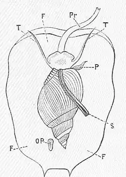 According to the observations of Quoy and Gaimard, the animal of this species is blind; and what renders it particularly remarkable, is a very large foot, extending from all parts of the shell. The operculum is exceedingly small. This mollusk possesses the power of absorbing by its foot, by means of pores with which this part is provided, a large quantity of water, which it throws off again, when it is disturbed, in several directions. It lives in deep water, and when it is brought towards the shore, its foot still farther enables it to bury itself in the sand. It is very voracious : it is generally taken, by placing a piece of flesh, as bait, in a net.[2]